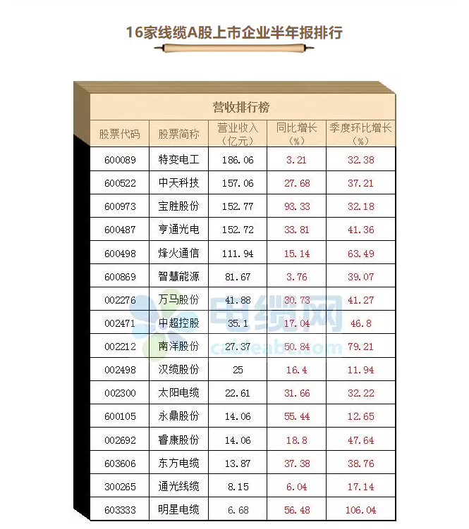 截至8月底,电线电缆行业主要的16家A股上市公司半年报披露工作正式落下帷幕。
