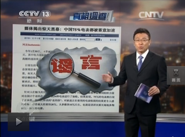 通过调查记者发现,一只电表从生产到安装入户,前后要经历六道关口进行质量把控,其中任何一道关口过不了都不可能安装入户。而国家质量监督检验检疫总局公布的,近年来对全国单相电能表产品质量抽查结果显示,合格率都在百分之九十以上。因此网上流传了近十年的有关电表被蓄意加速的说法毫无依据,是彻头彻尾的谣言。